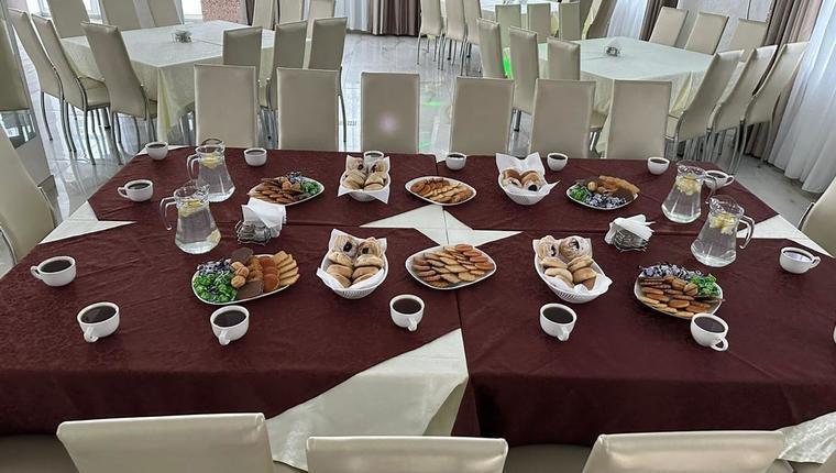 А именно: пирожки, чай, кофе, конфеты, артезианская вода с лимоном (в неограниченном количестве)