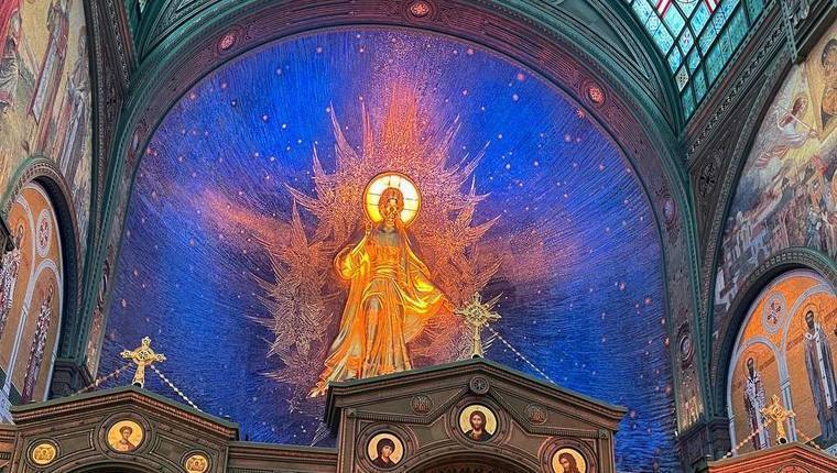 Роскошный Нижний храм, посвящен равноапостольному великому князю Владимиру - крестителю Руси. Здесь вы увидите великолепно украшенную мозаичными крестами купель, состоящая из трех бассейнов с лестницами и подсветкой.