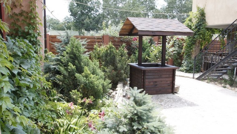 Гостей порадуют плодовые деревья: хурма, инжир, гранат. Внутри дворика расположен небольшой фонтан с водопадом из декоративного камня. Рядом с гостевым домом "Уют" расположена детская площадка, качели и футбольное поле.