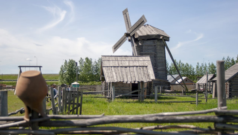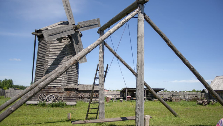Наша гордость – самая старая в Татарстане настоящая действующая ветряная мельница! (Построена руками женщин и подростков в 1943 г). Дом зажиточного крестьянина с сельскими животными. Дом гончара с печью для обжига глины. Дом кузнеца с кузницей. Баня почерному – все постройки настоящие, были перенесены по бревнышку из деревень Республики. Мечеть, воссозданная по проекту 17 века руками работников музей без единого гвоздя.