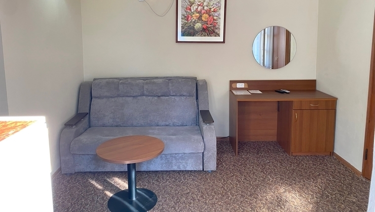 - 3-местный с кухней: Двуспальная + односпальная кровать, возможна доп. Еврораскладушка. Микроволновка, электроплита, посуда, холодильник, ТВ, сплит система, санузел с душем, фен, балкон.
