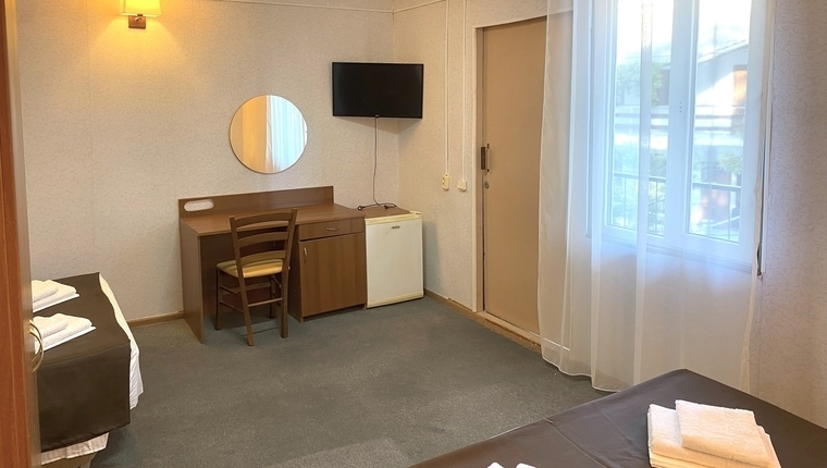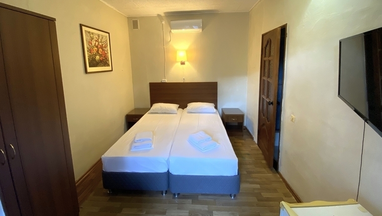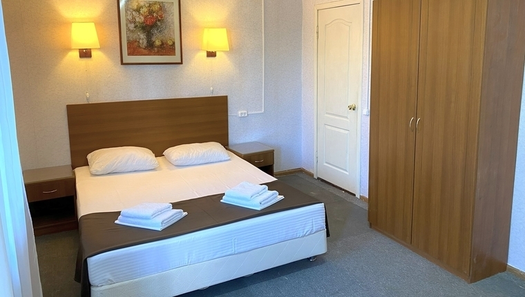 - 2-местный: Кровать (двуспальная или две односпальные). Холодильник, ТВ, сплит система, санузел с душем, фен, балкон.