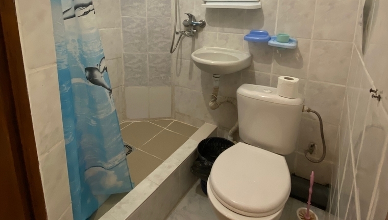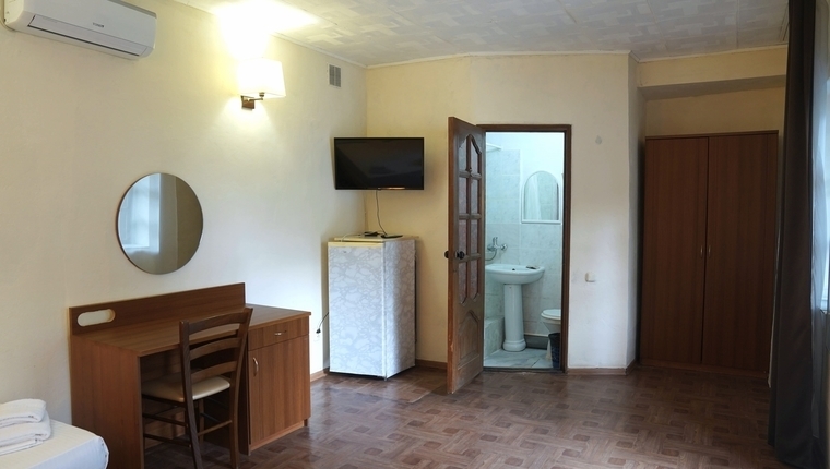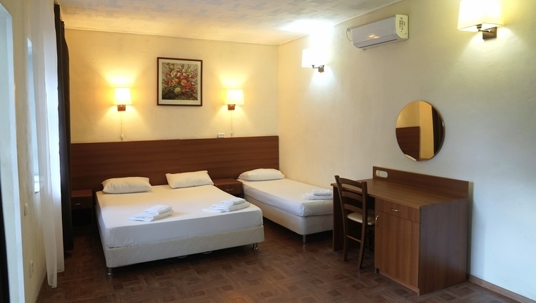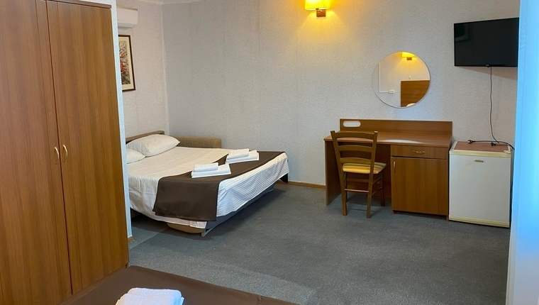 - 3-местный: Двуспальная + односпальная кровать, возможна доп. еврораскладушка. Холодильник, ТВ, сплит система, санузел с душем, фен, балкон.