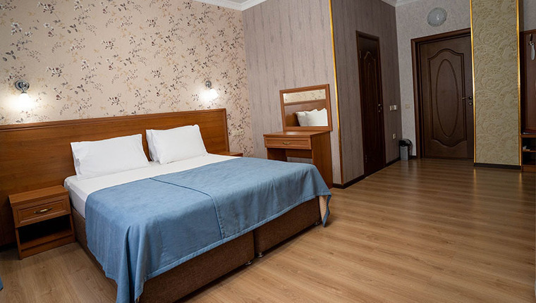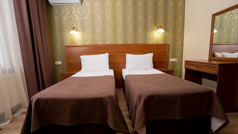 • Корпусная мебель: 1-двуспальная или 2 односпальные кровати, 2 тумбочки, шкаф, журнальный столик, настенное зеркало с вешалкой, подставка для багажа, сейф, сушилка для вещей, набор посуды