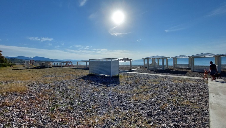Пляж: Благоустроенный собственный песчано-галечный пляж в 400 метрах от отеля, лежаки и зонты предоставляются за дополнительную плату.