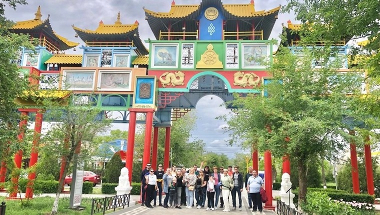 В самом сердце Элисты находятся Золотые ворота— уникальный экзотический памятник буддийской архитектуры, самая узнаваемая и любимая достопримечательность города, установленная в 90-х гг. прошлого века, иллюстрирующая всю историю жизни калмыков. 15-метровая арка золотистого цвета, поддерживаемая красными колоннами, несет в себе сакральный смысл — это символ священного порога, переступив через который, человек может духовно очиститься. За Золотыми воротами идет белокаменная дорожка, символизирующая путь добродетели. Пройдя под аркой, верующие начинают ощущать уверенность и силу.