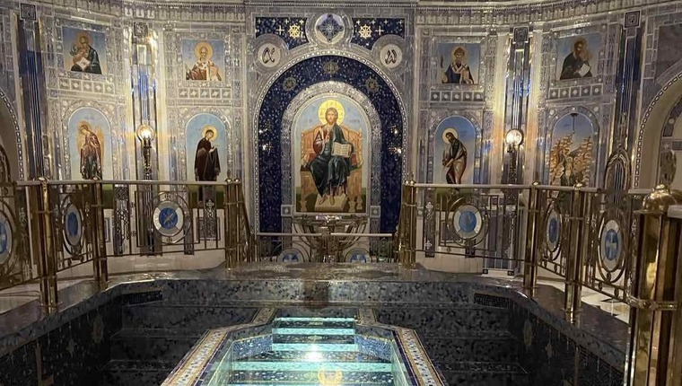 Роскошный Нижний храм, посвящен равноапостольному великому князю Владимиру - крестителю Руси. Здесь вы увидите великолепно украшенную мозаичными крестами купель, состоящая из трех бассейнов с лестницами и подсветкой.