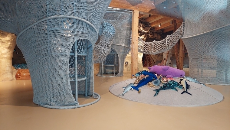 Размещенная под самым куполом аквапарка зона разделена на два блока: коралловый риф и глубоководье, состоящие из удивительных гротов и пещер. Оказавшись здесь, малыши отправляются в увлекательное путешествие по подводному миру. Удивительное пространство грота наполнено морскими раковинами, гигантскими губками, светящимися и звуковыми интерактивными элементами и огромными вязаными подушками в форме кораллов. Пол каменной пещеры - трехмерное изображение, воссоздающее мир морского глубоководья. Эффект полного погружения дополняют тематические светящиеся настенные витражи. В светлой зоне пол оборудован уникальными массажными зонами. В детской игровой зоне также расположен веревочный городок, скалодром, канатный комплекс, качели и сухой бассейн.