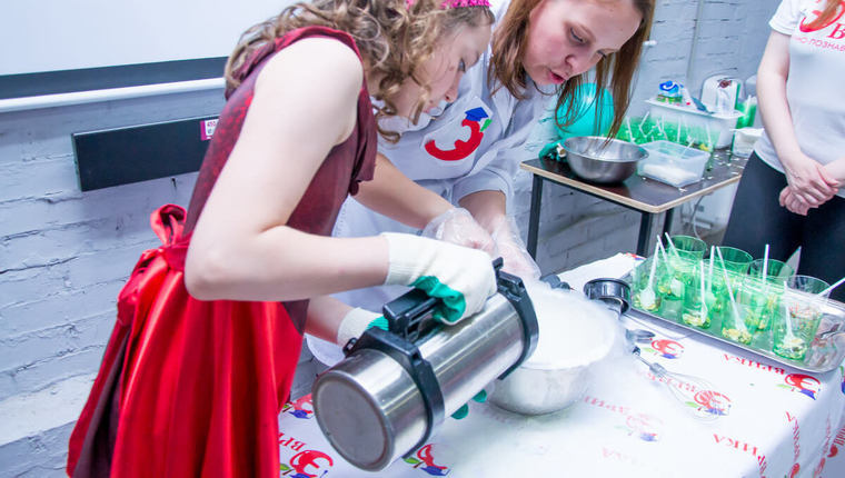 В конце программы участники сами делают основу для мороженого и заливают жидким азотом. Раскладывают получившееся мороженое по стаканчикам и кушают вкуснейшее мороженое. Облака тумана, замороженный попкорн и крио мороженое – это великолепно!