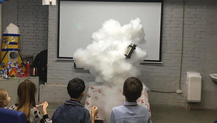Во время шоу проводятся эксперименты с жидким азотом, замораживают цветок, банан, попкорн.